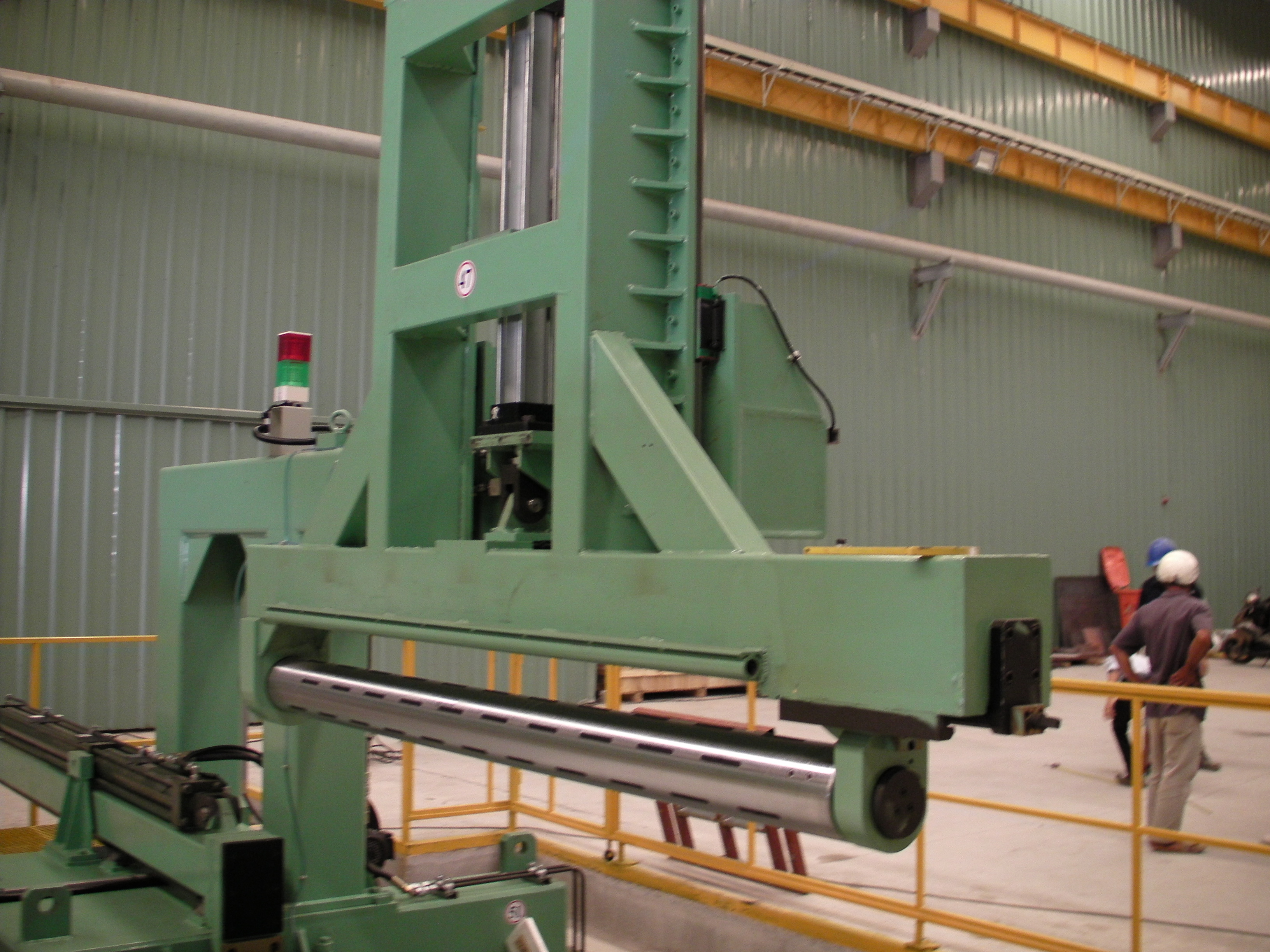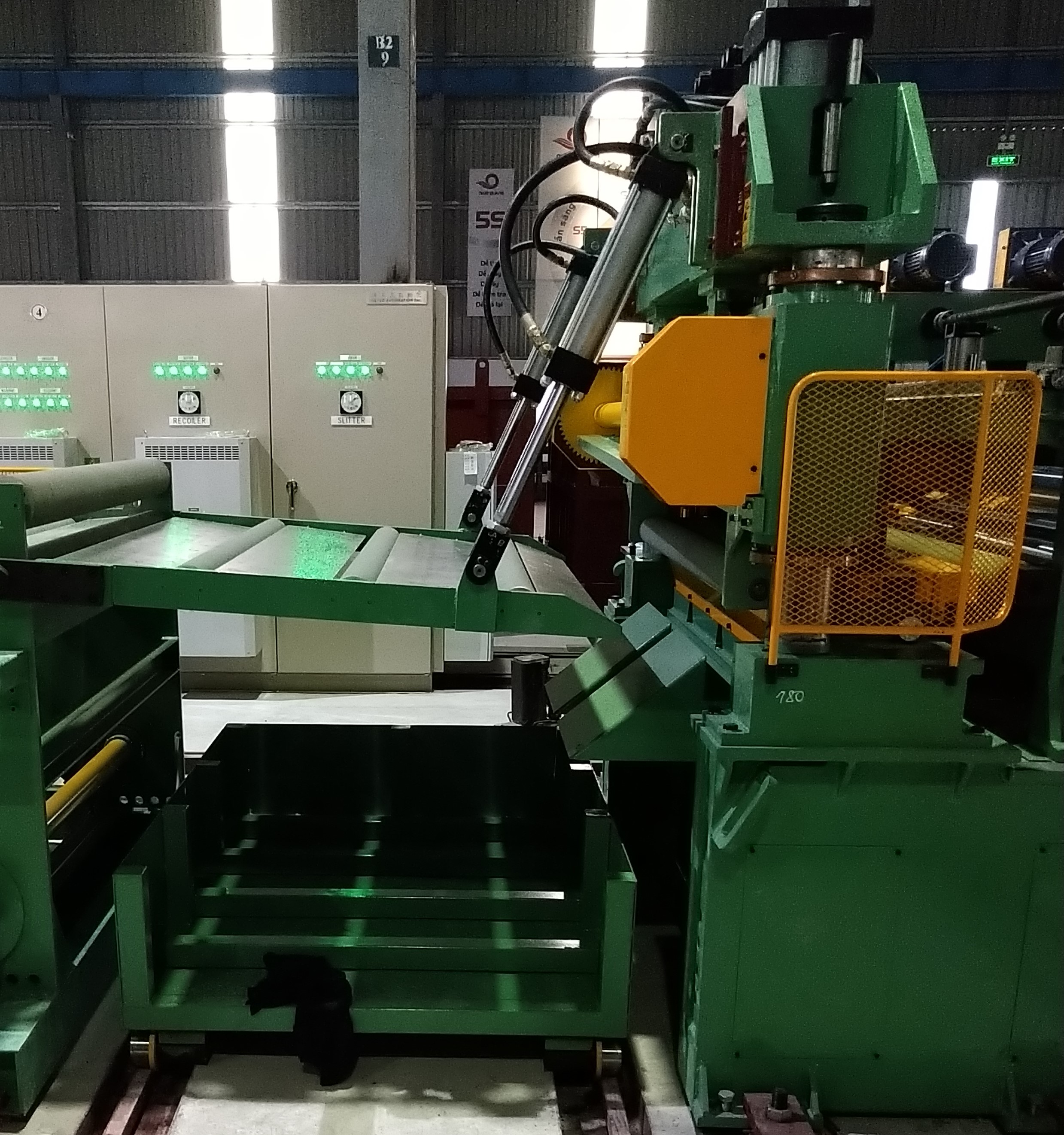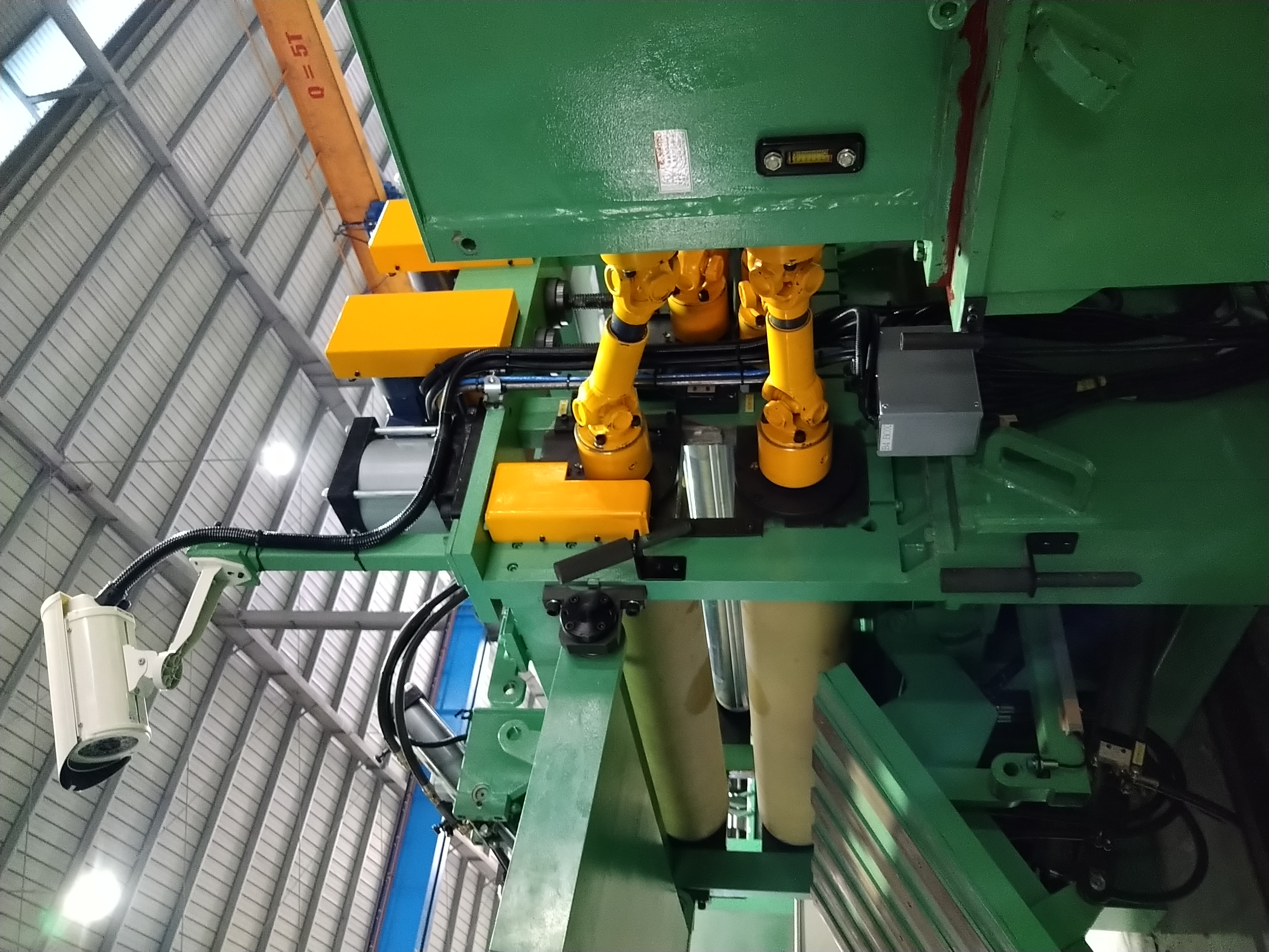 1. 鋼捲送料到板尾的時候,程式自動啟動,智能坑洞上的中間橋自動升起,機台速度變慢然後自動停 止。