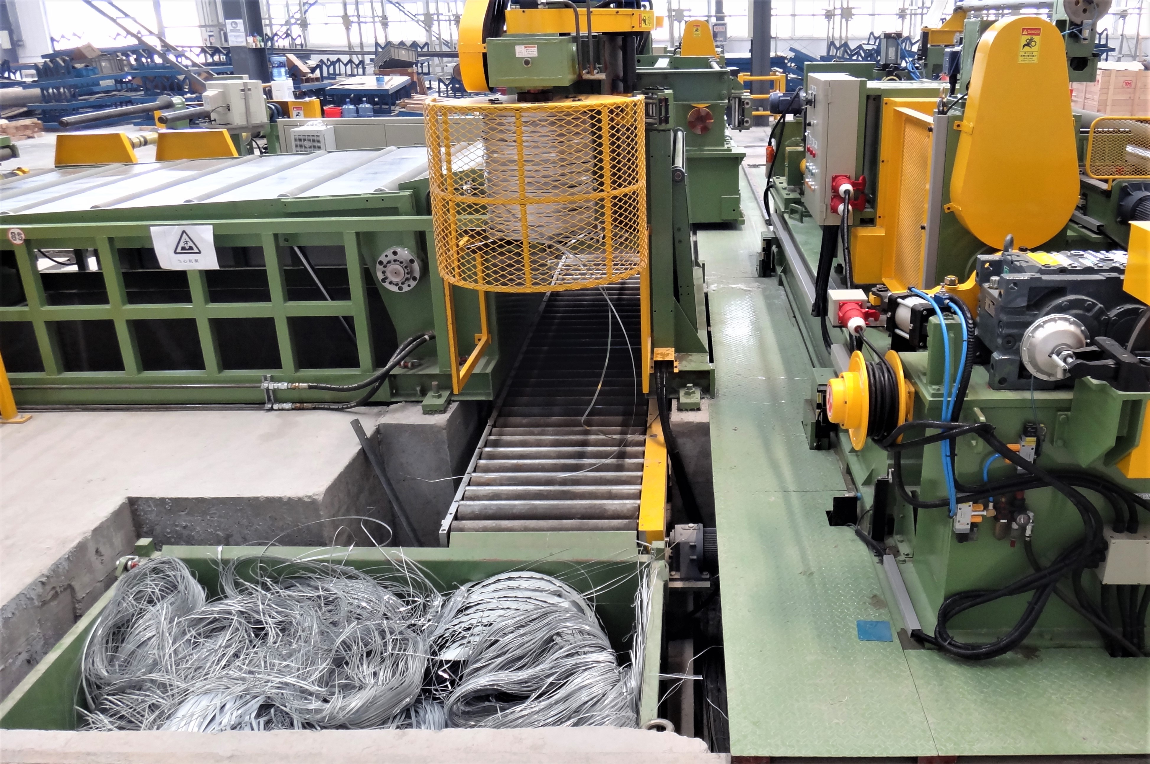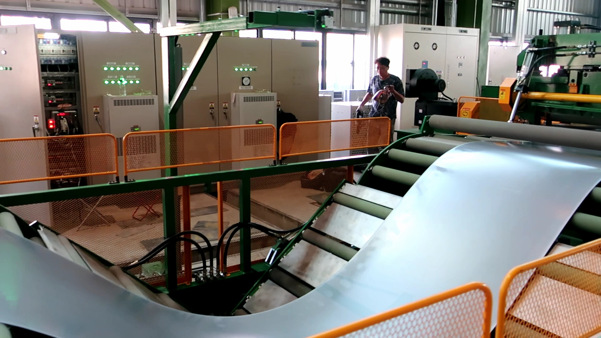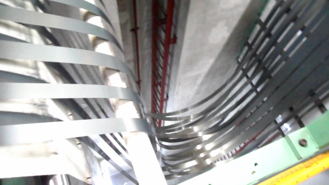 1. 鋼捲送料到板尾的時候,程式自動啟動,智能坑洞上的中間橋自動升起,機台速度變慢然後自動停 止。