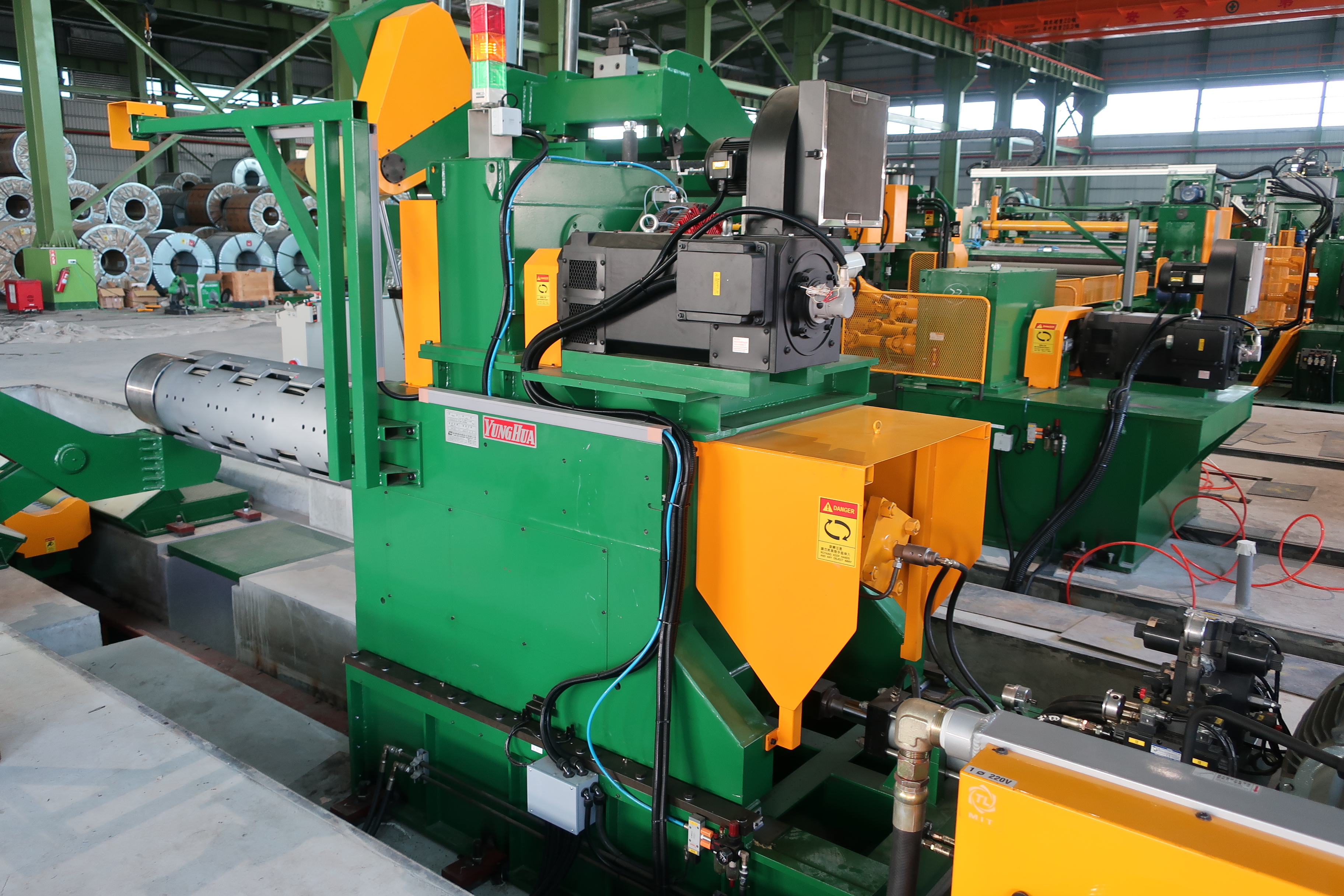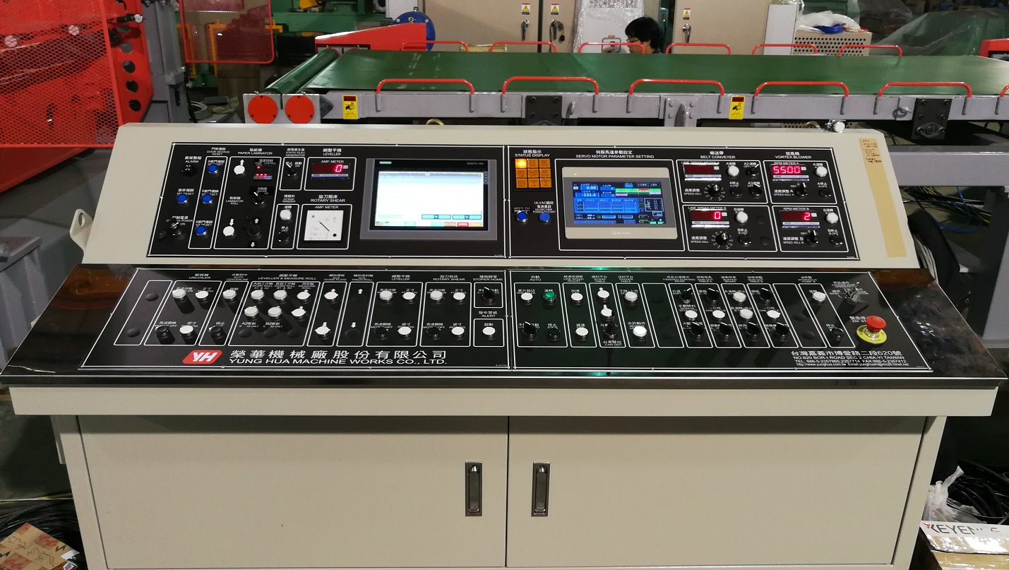 1. 生產線多個重要的單機由都是由伺服馬達同步控制扭力及速度。重要的單機包含解卷機、整平機、裁剪機、廢料捲、張力輪、以及捲料機。